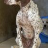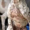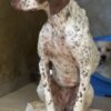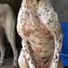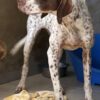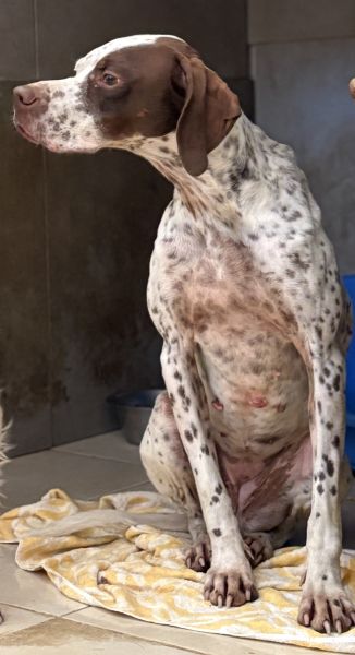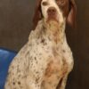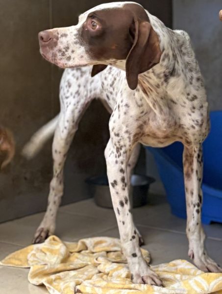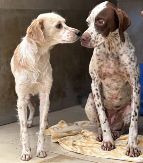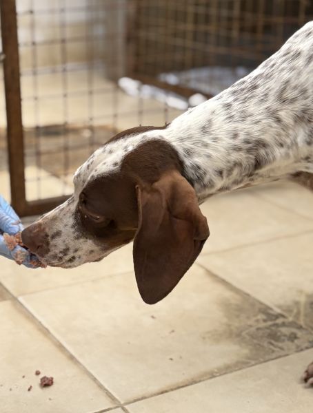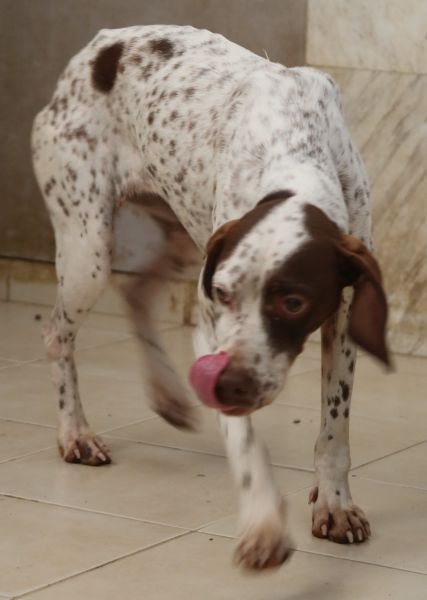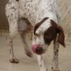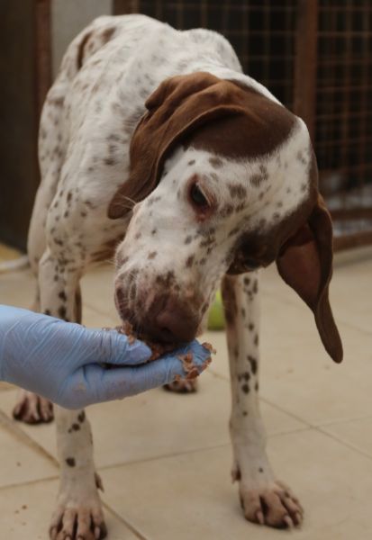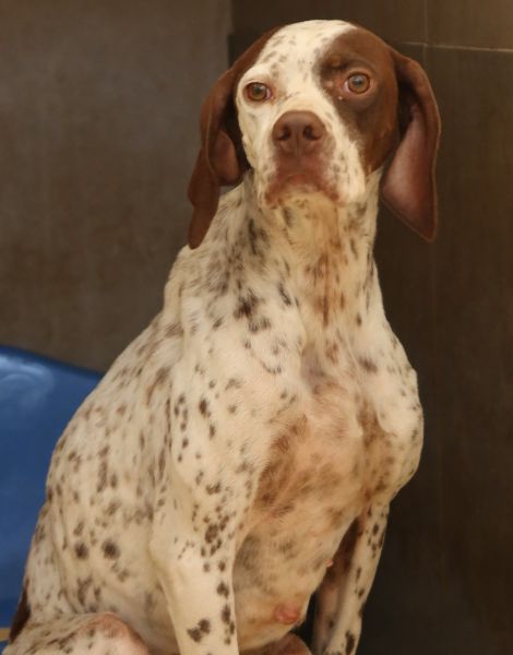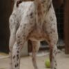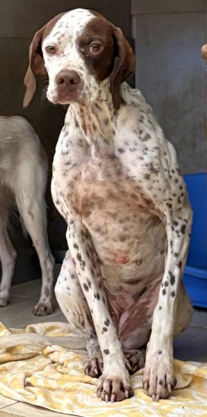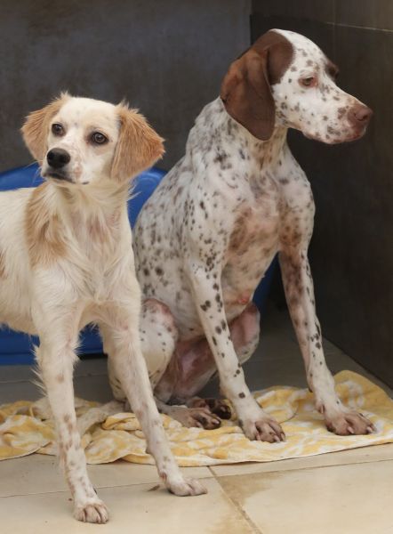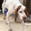 Acira ist eine ganz bezaubernde Hündin. Ihr helles, kurzes Fell ist mit markanten braunen Flecken an Kopf und Körper gezeichnet. Besonders auffällig sind ihre jagdhundtypischen Schlappohren und die braune Zeichnung um eines ihrer Augen. Ihre hellbraunen Augen blicken neugierig und zugleich vorsichtig in die Welt.
