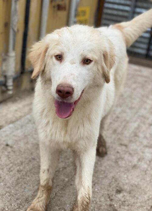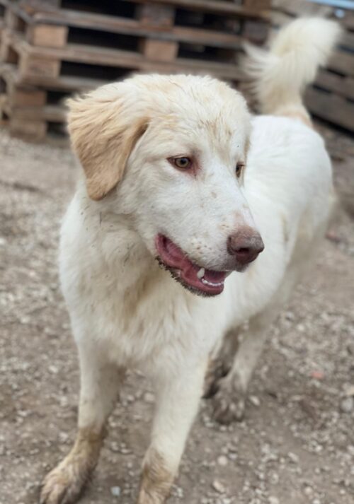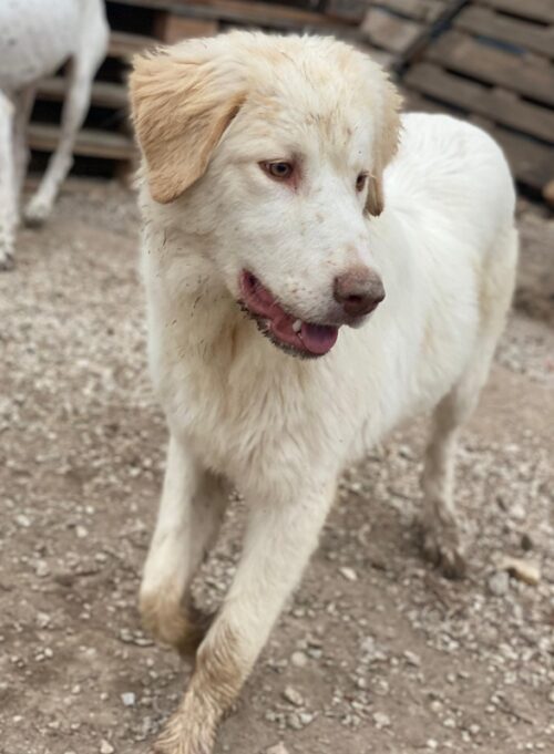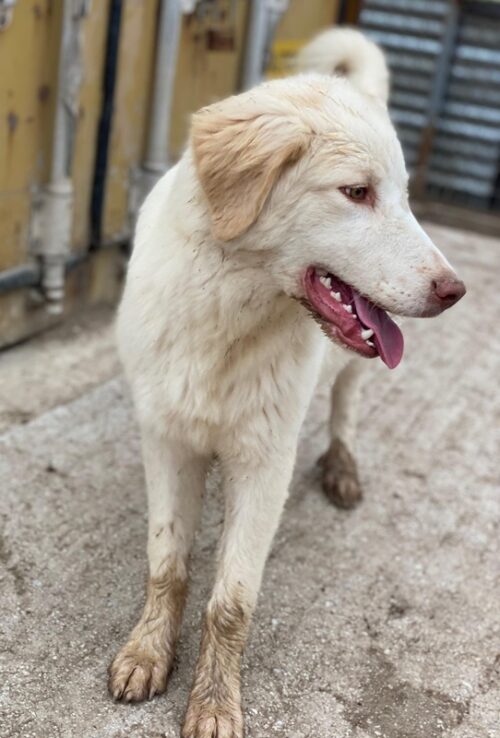 Bei Balda handelt es sich um ein knuffiges Welpenmädchen mit einem sehr flauschigen, cremefarbenen Fell. Sie hat hübsche helle Augen und man kann jetzt bereits erahnen, dass sie mal zu einer stattlichen Hundedame heranwachsen wird. Neben einer tollen Optik bringt Balda auch einen liebenswerten Charakter mit. Sie geht aufgeschlossen und freundlich auf die HelferInnen zu, ist verschmust und verspielt sowie derzeit verträglich im Umgang mit ihren Artgenossen.