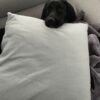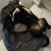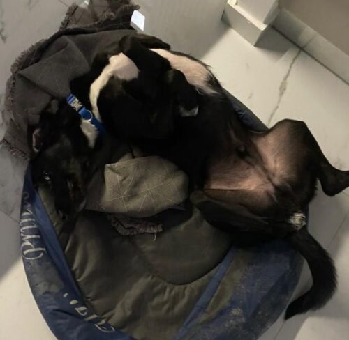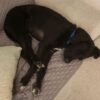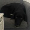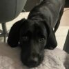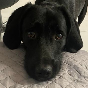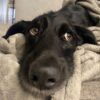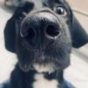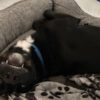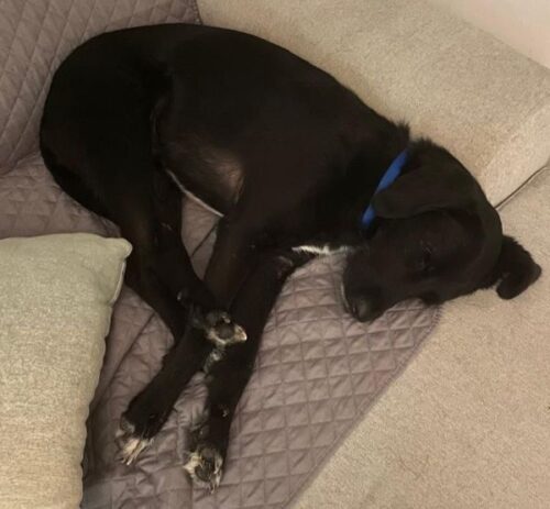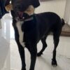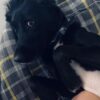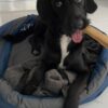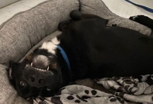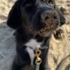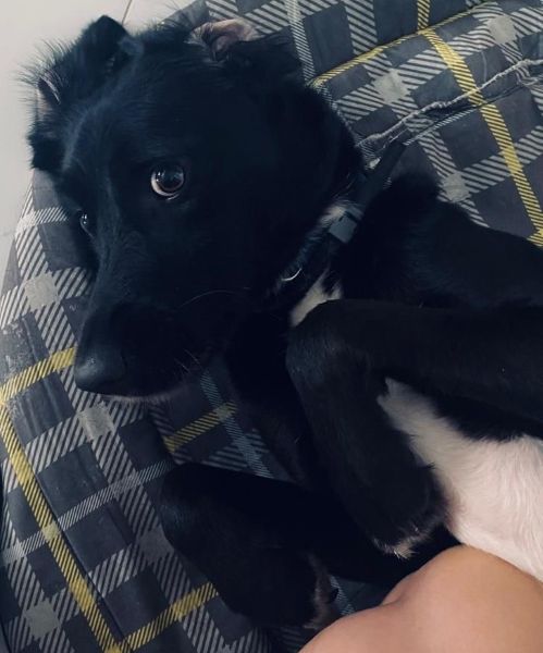 Emrys ist ein wunderschöner Rüde. Sein Fell ist glänzend schwarz, und er hat sehr süße Schlappohren. Außerdem ziert ein großer weißer Fleck seine Brust.