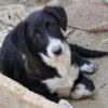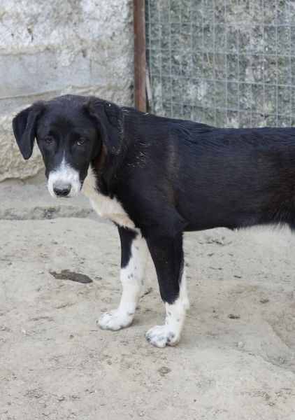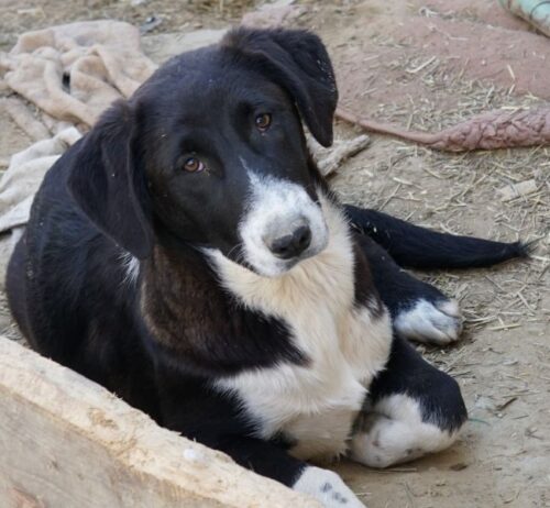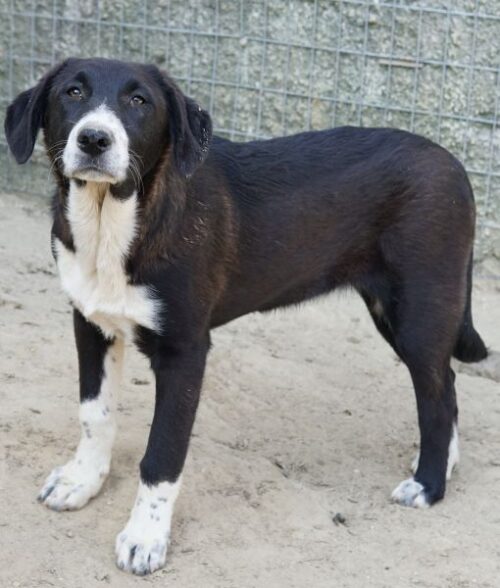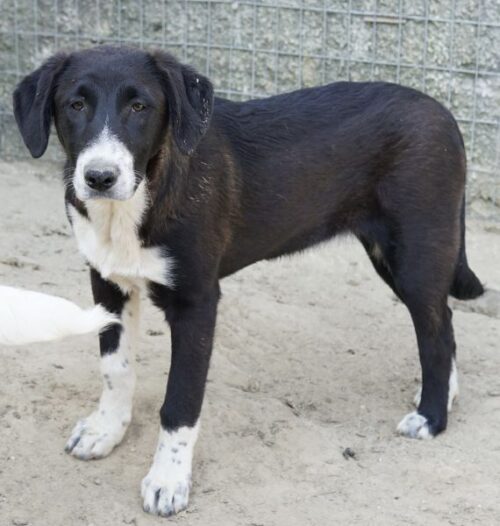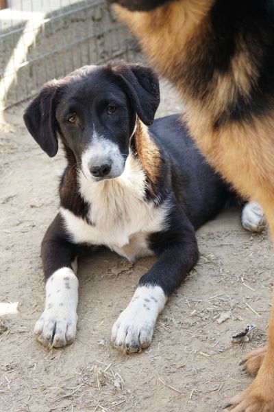 Pinot Noir ist ein hübsches, schwarz-weißes Hundemädchen mit einer tollen Fellzeichnung. Zudem trägt sie weiße Söckchen, was ganz besonders süß ist.
