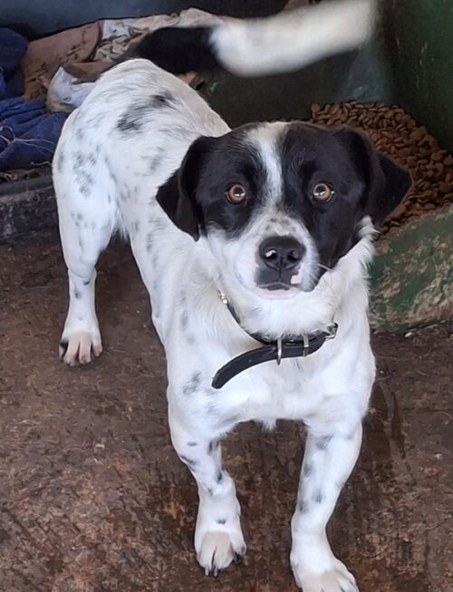 Papa Skittles ist ein entzückender kleiner Kerl, der aufgrund seiner Optik sofort auffällt. Sein weißes Fellkleid ist mit schwarzen Punkten übersät, während der Kopf bis auf die weiße Blesse schwarz ist. Seine karamellbraunen Augen bilden einen tollen Kontrast dazu. Er ist einer unserer kleinsten Rüden, möchte aber dennoch gern einen großen Platz im Herzen seiner neuen Familie einnehmen.