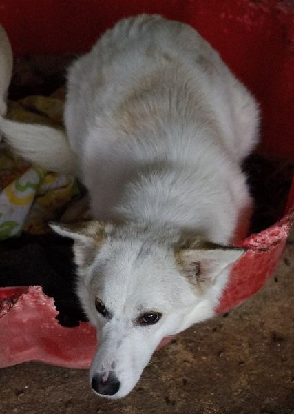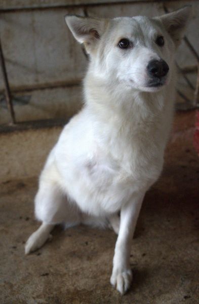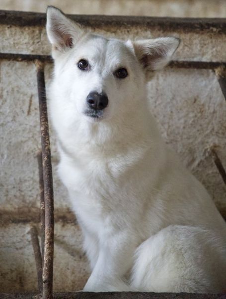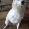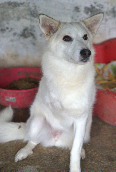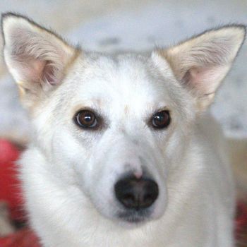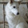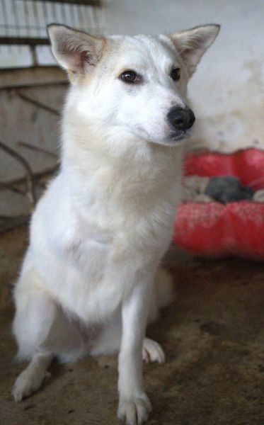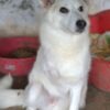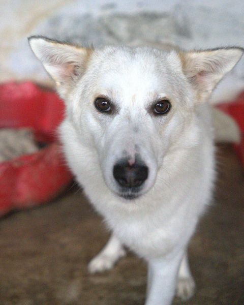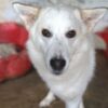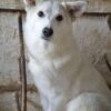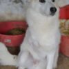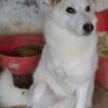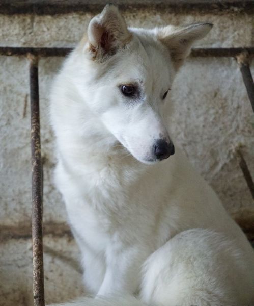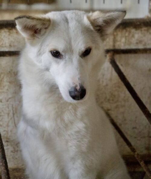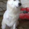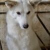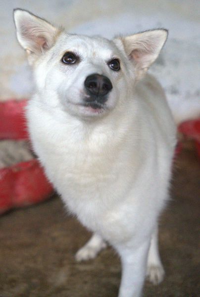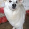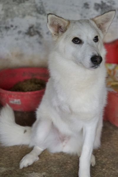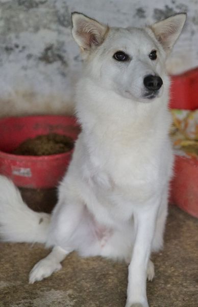 Thimia ist eine zuckersüße Hundedame. Sie trägt ein weißes Fellkleid mit einigen hellbraunen Akzenten auf dem Rücken. Besonders auffallend sind ihre Stehohren und ihr liebevoller Blick aus ihren großen, dunklen Augen.