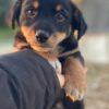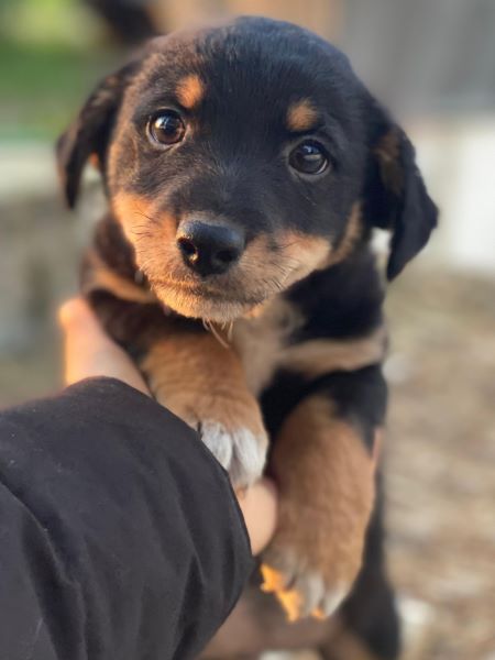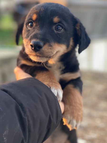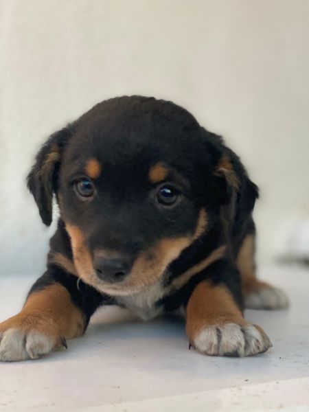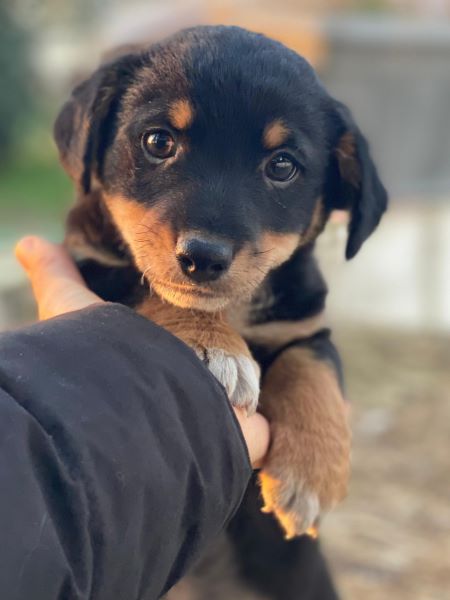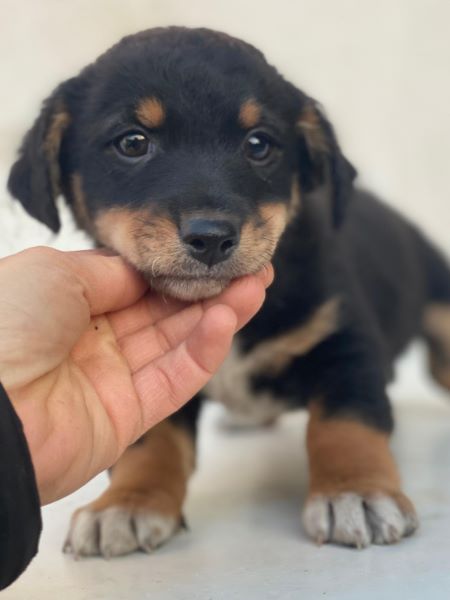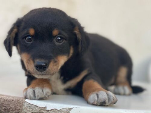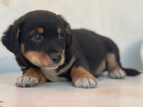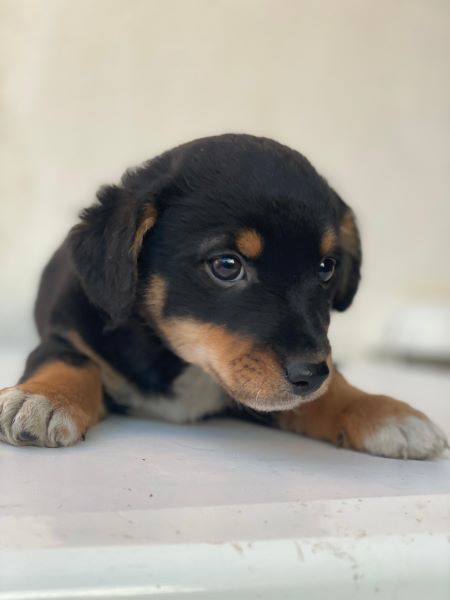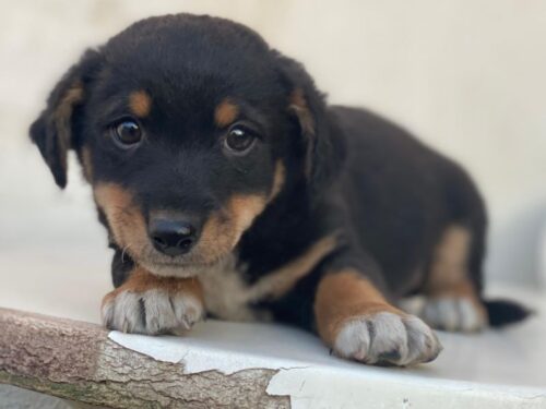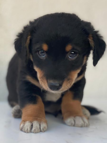 Hier kommt unser Tinos. Der kleine, zuckersüße Welpenjunge trägt ein dreifarbiges Fellkleid. Er hat im Gesicht hellbraune Akzente und trägt eine weiße Zeichnung an der Brust und hat weiße Akzente an den Pfoten. Außerdem zeichnen ihn dunkle, große Augen mit einem liebevollen Blick aus. Tinos zeigt sich freundlich den Menschen gegenüber und ist welpentypisch verspielt. Er liebt es, mit seinen Geschwistern umherzutollen und verträgt sich ebenfalls gut mit den anderen Hunden auf der Pflegestelle.