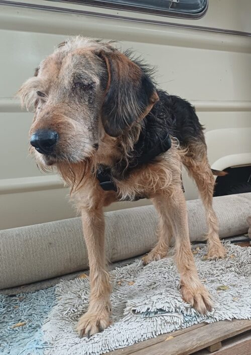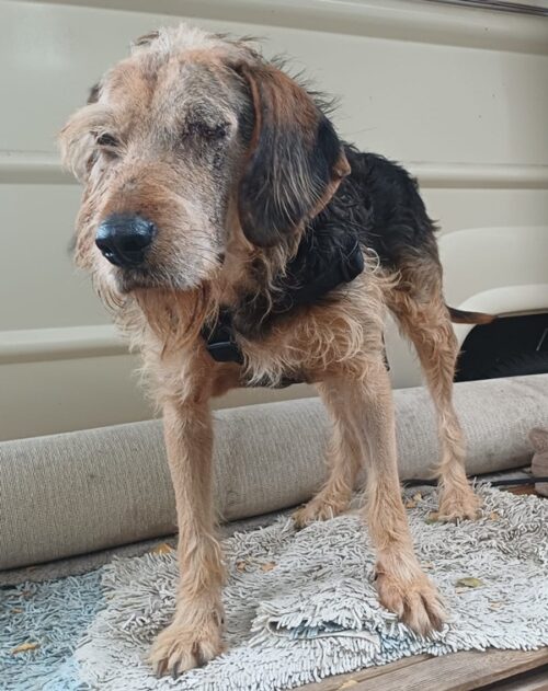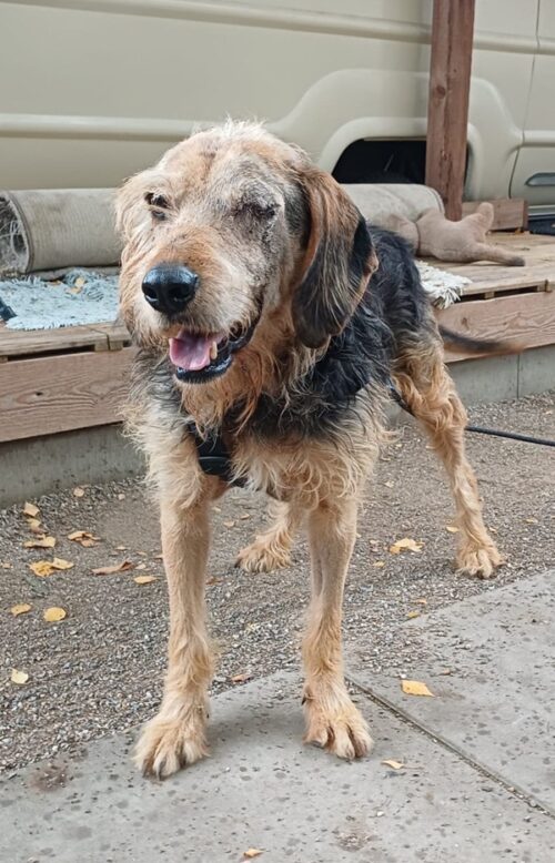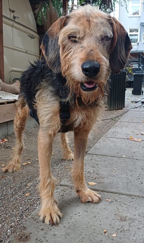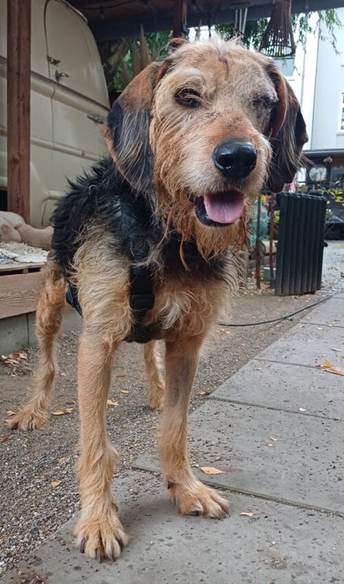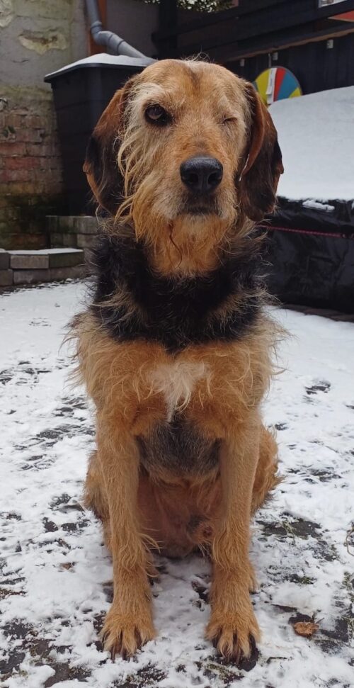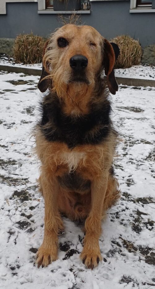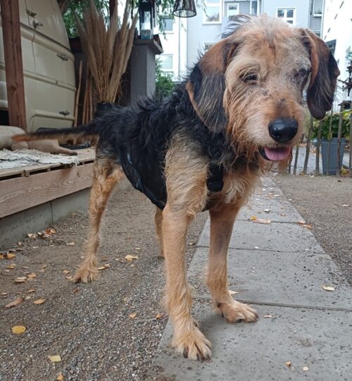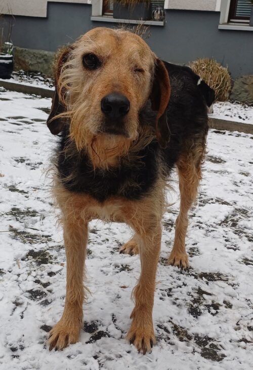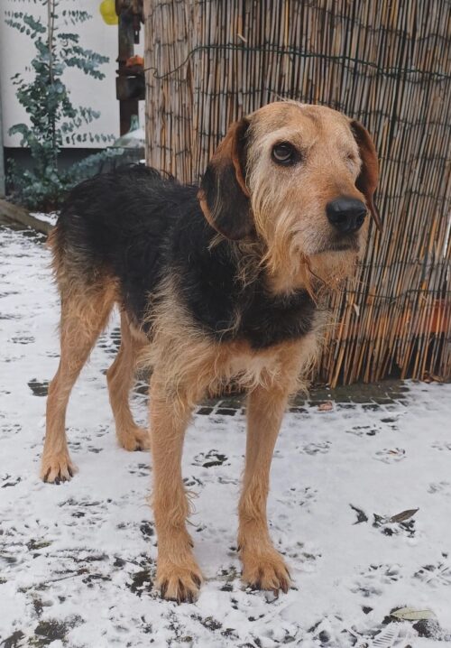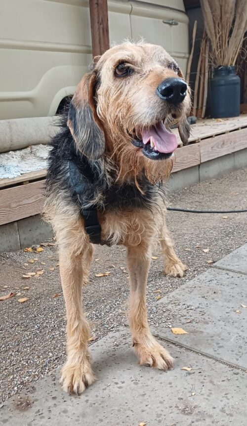 Yasko ist ein braun-schwarzer, mittelgroßer Jagdhund-Rüde mit drahtigem Fell. Er hat ein süßes Bärtchen und lange Schlappohren. Da sich Yasko im Tierheim in Serres sein linkes Auge stark verletzt hat, musste es ihm entfernt werden. Mit seinem kleinen Handicap kommt er jedoch sehr gut zurecht.
